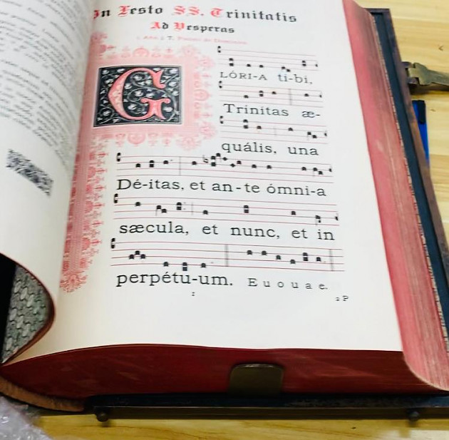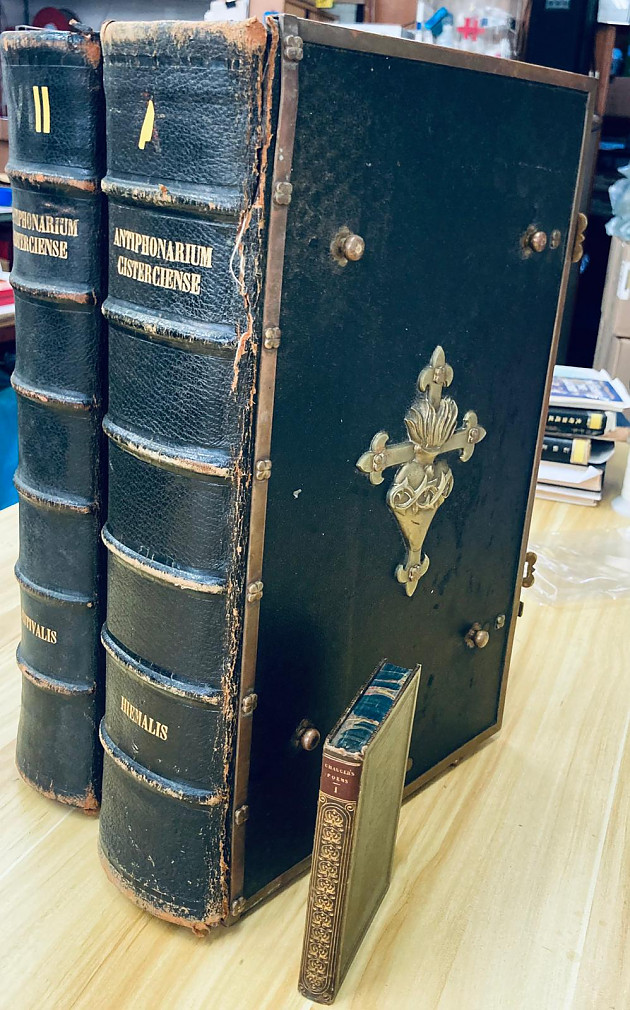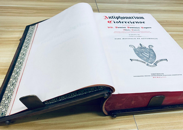這一次我們難得開箱的是被形容為「Massive」的重磅書,而且一來就是一對。每本淨重26磅,呎吋為13 x 20 x 4 1/2吋。這一套兩巨冊是天主教嚴規熙篤會的《熙篤會對唱曲集》Antiphonale Cisterciense,書名「對唱曲」(Antiphon)指的是一種天主教傳統短曲,在詠唱聖經15篇聖詠 / 詩篇(Psalms)前及後唱的,而在全年不同的耶穌基督、聖母、聖人的節日會有不同的對唱曲。上冊為《冬季及春季》下冊為《夏季及秋季》。大家都可以看到書的巨大,是為了方便幾個信徒一起看一起對唱,也象徵著一個團體的精神。