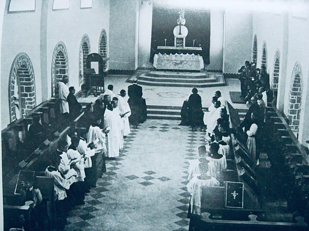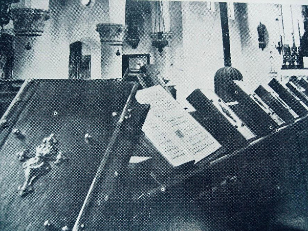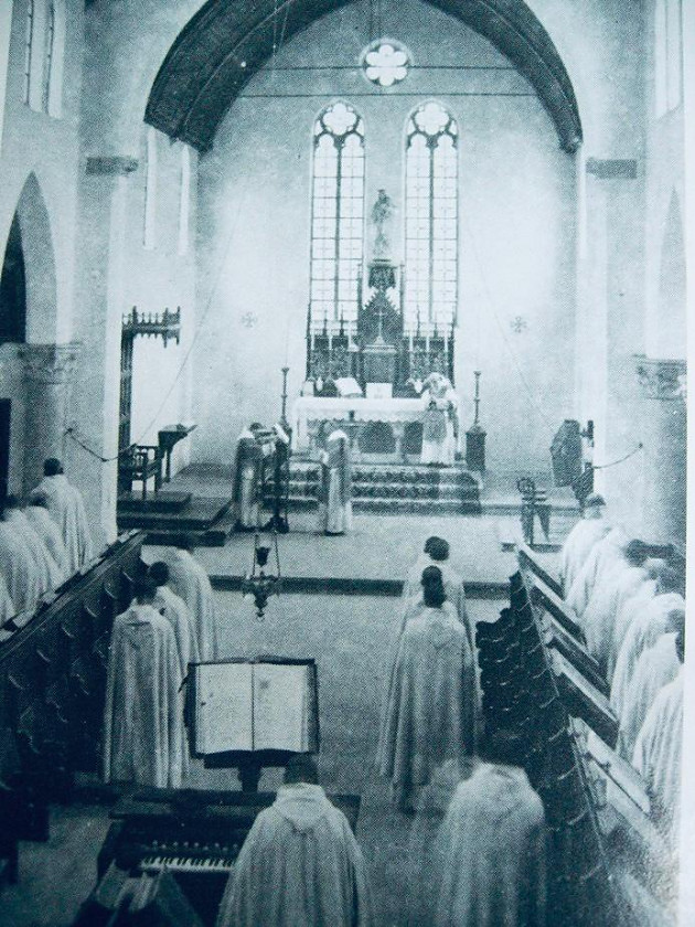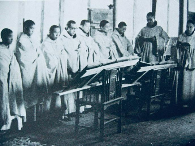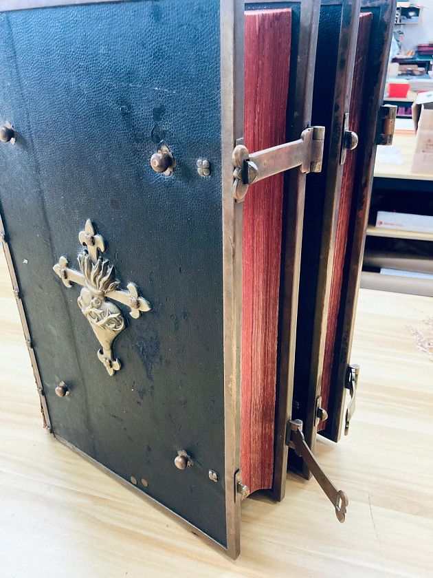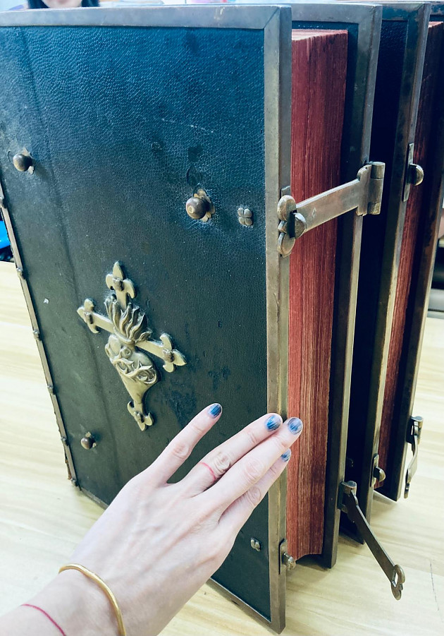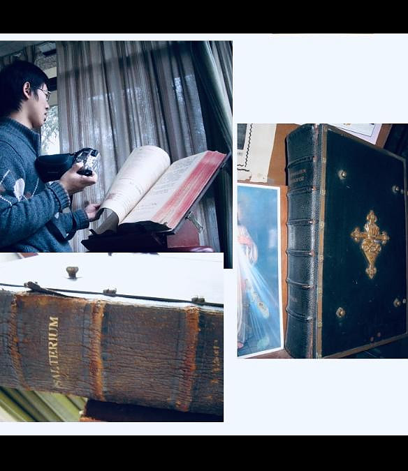 其實我哋圍住研究書面黃銅裝置,都幾似圍爐的書痴信徒。大家睇到書腳下方有一個貌似腳踏位,當然是因為書身太重太巨大,而加建的。書頭繩要用棉繩把整本書紥起,才令到書頁不斷地翻揭都沒有下塌的問題。此書是1947年在法國印刷的版本,全世界的熙篤會隱修院都在使用。在1949年前,熙篤會在中國亦有兩個隱修院,其後部份隱修士輾轉來到香港,並在香港大嶼山創立了聖母神樂院,亦即十字牌牛奶的出品地。
