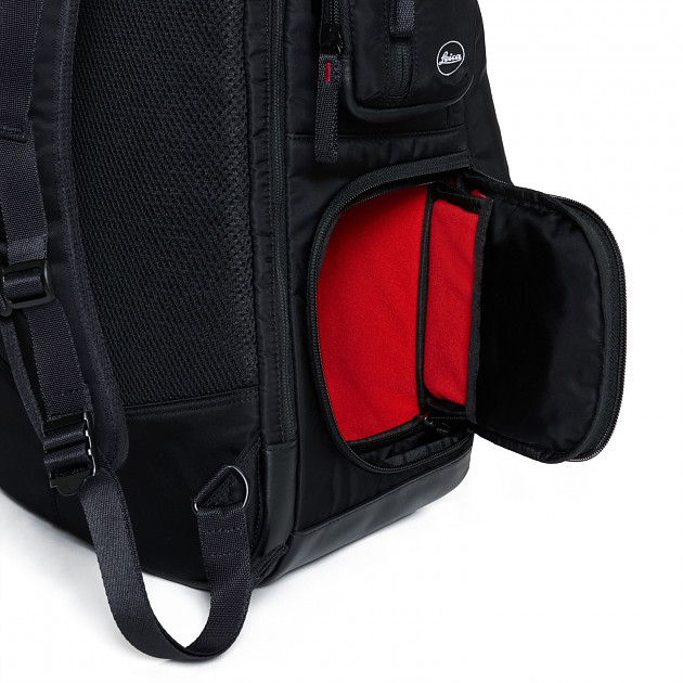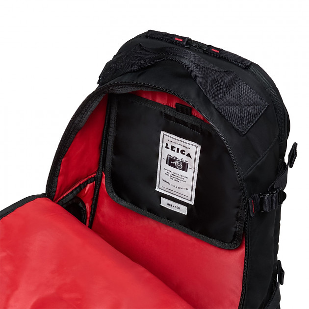 Leica I一百周年紀念Tag設計源自Leica Archive,採用Tyvek物料製成,質感如同紙張,散發著懷舊氣息。背包和收納袋底部採用防雨防污Scotchgard防潮皮革製成,兼具實用性和裝飾美感。背包採用雙層設計,具有寬敞主隔層和可容納13吋電腦後置襯墊口袋。背包主隔層內有一個相機袋,容量足以容納一台相機和兩個鏡頭,內部襯有拉絨物料,可保護相機免受刮擦。外部設有一個用於存放攝影器材和SD卡的口袋。背包和相機袋均配有側邊拉鏈,無需從背包中取出相機袋即可從外部取用相機。相機袋可以固定於背包背帶或D形環上,相機袋前袋更可以用來存放無線耳機等小物。
