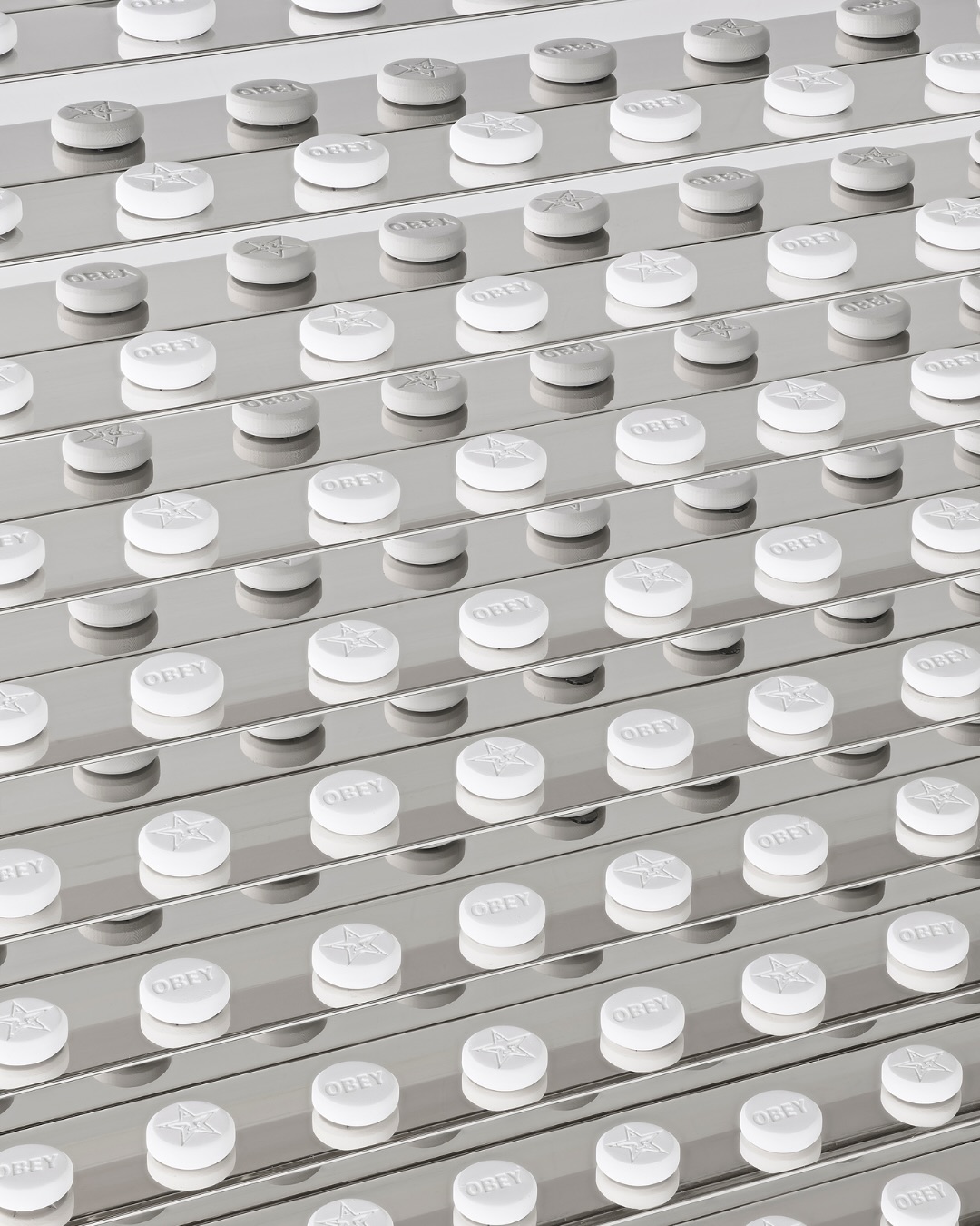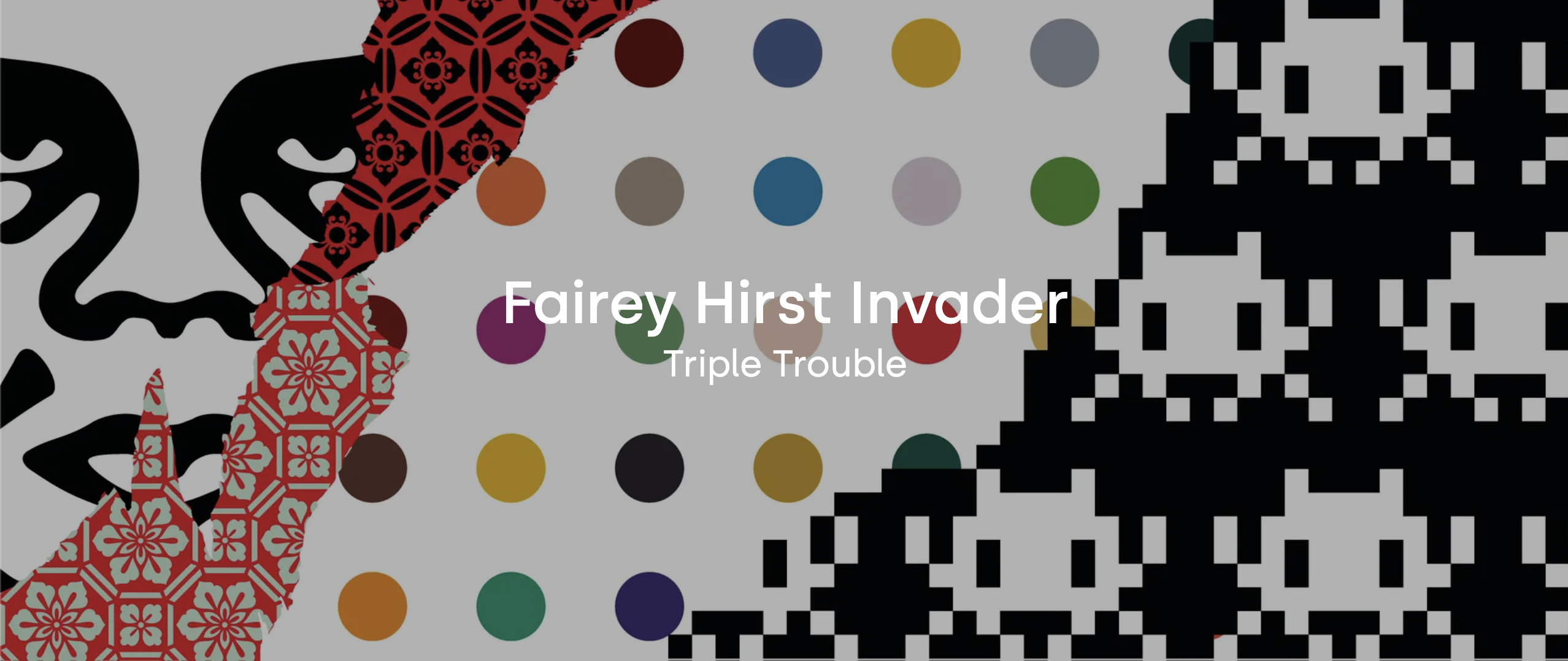 「展覽涵蓋繪畫、雕塑、裝置和馬賽克,探索當代藝術、街頭文化和流行圖像交會。Fairey+Hirst+Invader聯手創作一系列難以歸類混合作品,同時彰顯對重複、符號和文化符號共同迷戀。