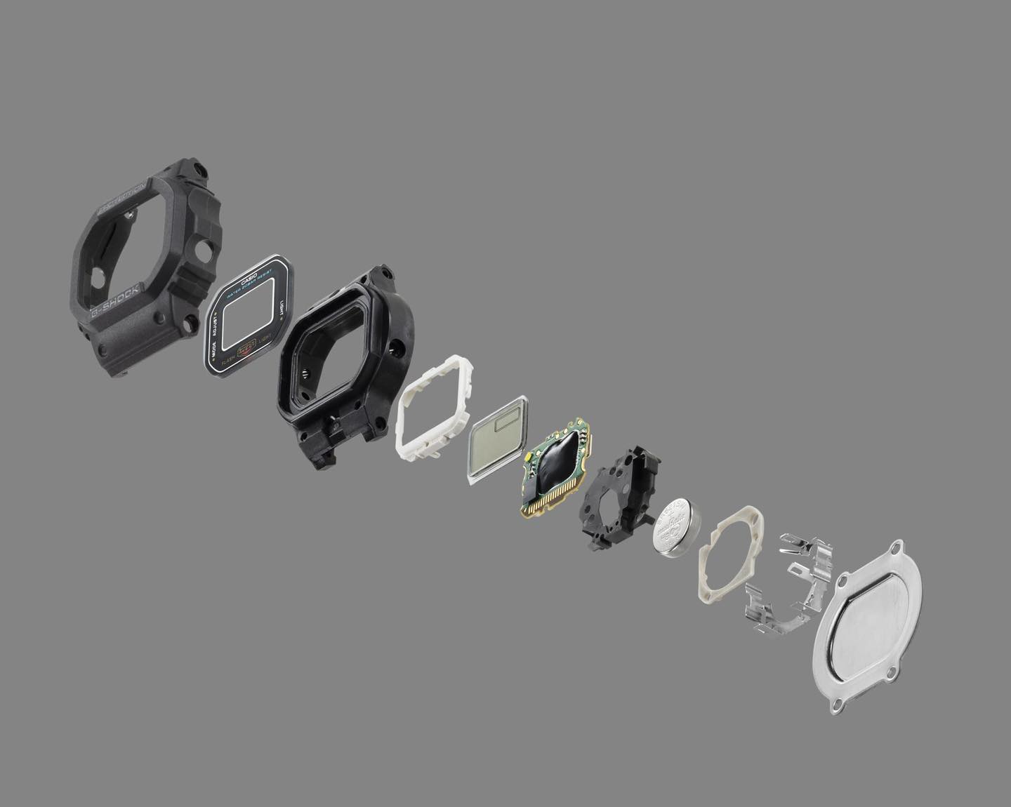 DW-5600十分之一尺寸完美貼合手指,並還原側鍵、扣環和顯示器。與所有G-SHOCK腕錶一樣堅固耐用,提供防震性能及可更換電池,防水深度達20 Bar,並具有雙時區、秒錶和自動日曆等基本功能。按鈕、錶扣和錶背則採用與原版相同不銹鋼物料,更可以使用錶帶孔來調整錶帶以適合手指(約48~82mm),就好似普通手錶一樣。高密度安裝技術和小型電池使模組尺寸縮小至傳統手錶約十分之一。